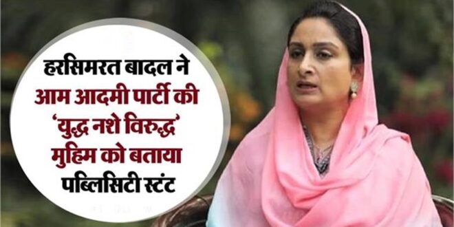 बठिंडा: शिरोमणि अकाली दल की सीनियर लीडर हरसिमरत कौर बादल ने राज्य की आम आदमी पार्टी (AAP) सरकार के ‘युद्ध नशे विरुद्ध’ कैंपेन पर तीखा तंज कसा है। उन्होंने ट्विटर पर एक खबर शेयर करते हुए कैंपेन को ‘पब्लिसिटी स्टंट’ बताया है। हरसिमरत कौर बादल ने कहा कि ड्रग्स की बुराई को खत्म करने के लिए कोई ठोस कदम उठाने के बजाय AAP सरकार इस गंभीर मुद्दे पर सिर्फ राजनीति कर रही है।