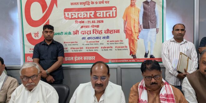 गोंडा, 21 मार्च 2026। उत्तर प्रदेश सरकार के 9 वर्ष पूर्ण होने के अवसर पर जनपद गोंडा के सर्किट हाउस में एक प्रेस वार्ता का आयोजन किया गया। कार्यक्रम में प्रदेश के कैबिनेट मंत्री एवं जनपद के प्रभारी मंत्री दारा सिंह चौहान मुख्य रूप से उपस्थित रहे।