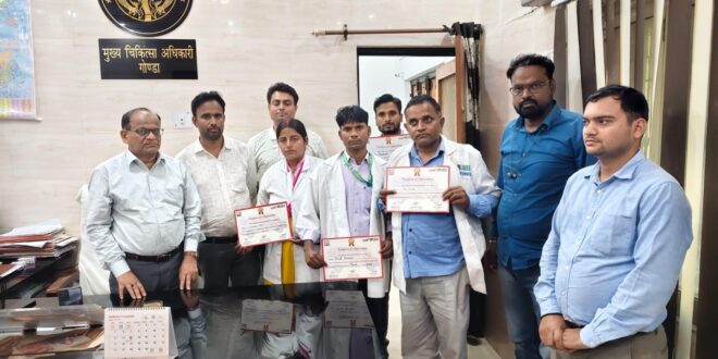 गोण्डा – जनपद गोण्डा में ई.एम.आर.आई. ग्रीन हेल्थ सर्विसेस द्वारा चलाई जा रही 102/108 एम्बुलेंस सेवा के प्रशिक्षित इमरजेंसी मेडिकल टेक्नीशियनों (ईएमटी) को सीएमओ डॉक्टर सन्त लाल पटेल ने ईएमटी दिवस के अवसर पर प्रमाण पत्र देकर सम्मानित किया। इस दौरान उत्कृष्ट कार्य करने वाले ईएमटी मिथलेश सिंह, राम किशन, संदीप शुक्ला, ओम प्रकाश सहित अन्य कर्मचारियों को सम्मानित किया गया।