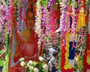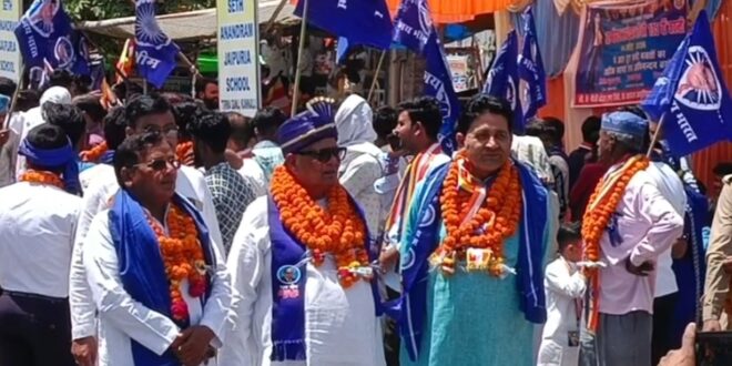 जोश खरोश के बीच अपने अपने हाथों में नीले झंडे लेकर नाचती गाती और थिरकती सैकड़ों की संख्या में महिला पुरुषों की भीड़ ने पुष्प वर्षा और जगह जगह स्वागत के बीच भारत रत्न बाबा साहब डा. भीम राव आंबेडकर की 135 वीं जयंती पर भव्य शोभायात्रा निकाली।
