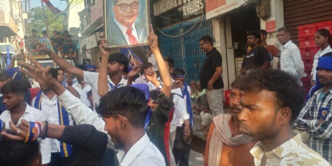सैकड़ों की संख्या में पुरुषों की भीड़ ने पुष्प वर्षा और जगह जगह स्वागत के बीच भारत रत्न बाबा साहब डा. भीम राव आंबेडकर की 135 वीं जयंती पर भव्य शोभायात्रा निकाली।